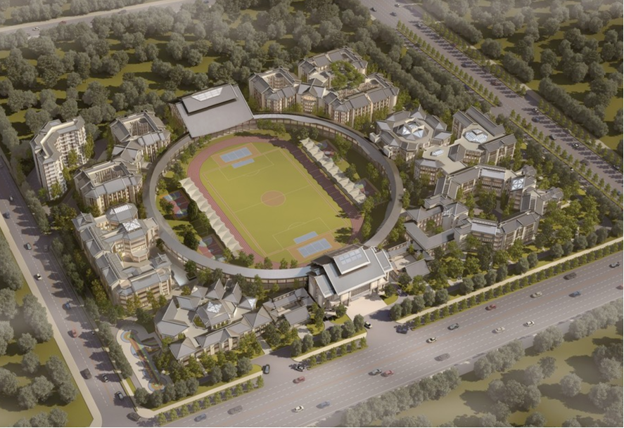 中心空旷为主,体现尊天敬地,天地人和,万象更新。圆心为凝聚点,由圆心引出四个南北东西主轴和主轴旋转45°生成四个次轴。南方位是剧场,代表艺术、戏曲、音乐,北方位是体育馆,代表活力、竞技、协作、韧性;东西两方位是两个图书馆,代表认知、经验、求学、探索。次方位是教学楼和宿舍,代表教育、传承、关爱、凝聚力