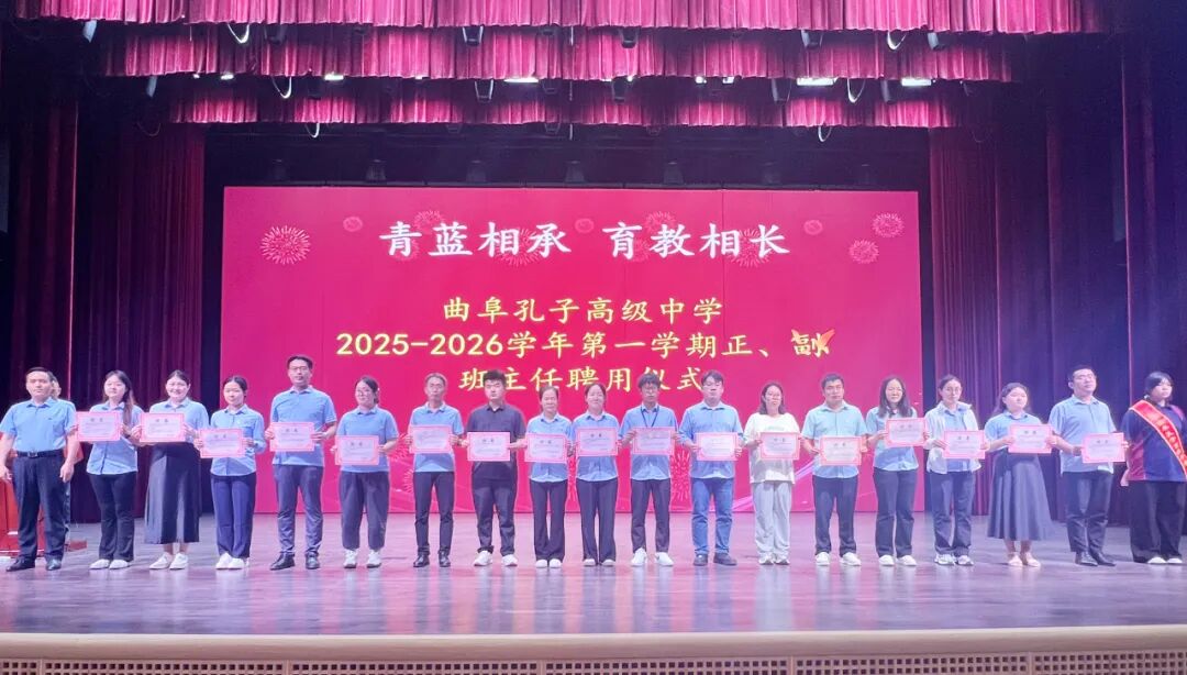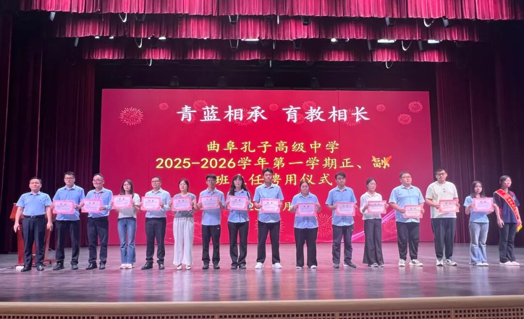 为加强班主任梯队建设,创新德育管理模式,9月8日晚曲阜孔子高级中学在大剧院隆重举行2025-2026学年第一学期正、副班主任聘用仪式。此次首创"正副班主任"结对模式,旨在通过"传帮带"机制,培养班主任后备力量,全面提升学校育人水平。